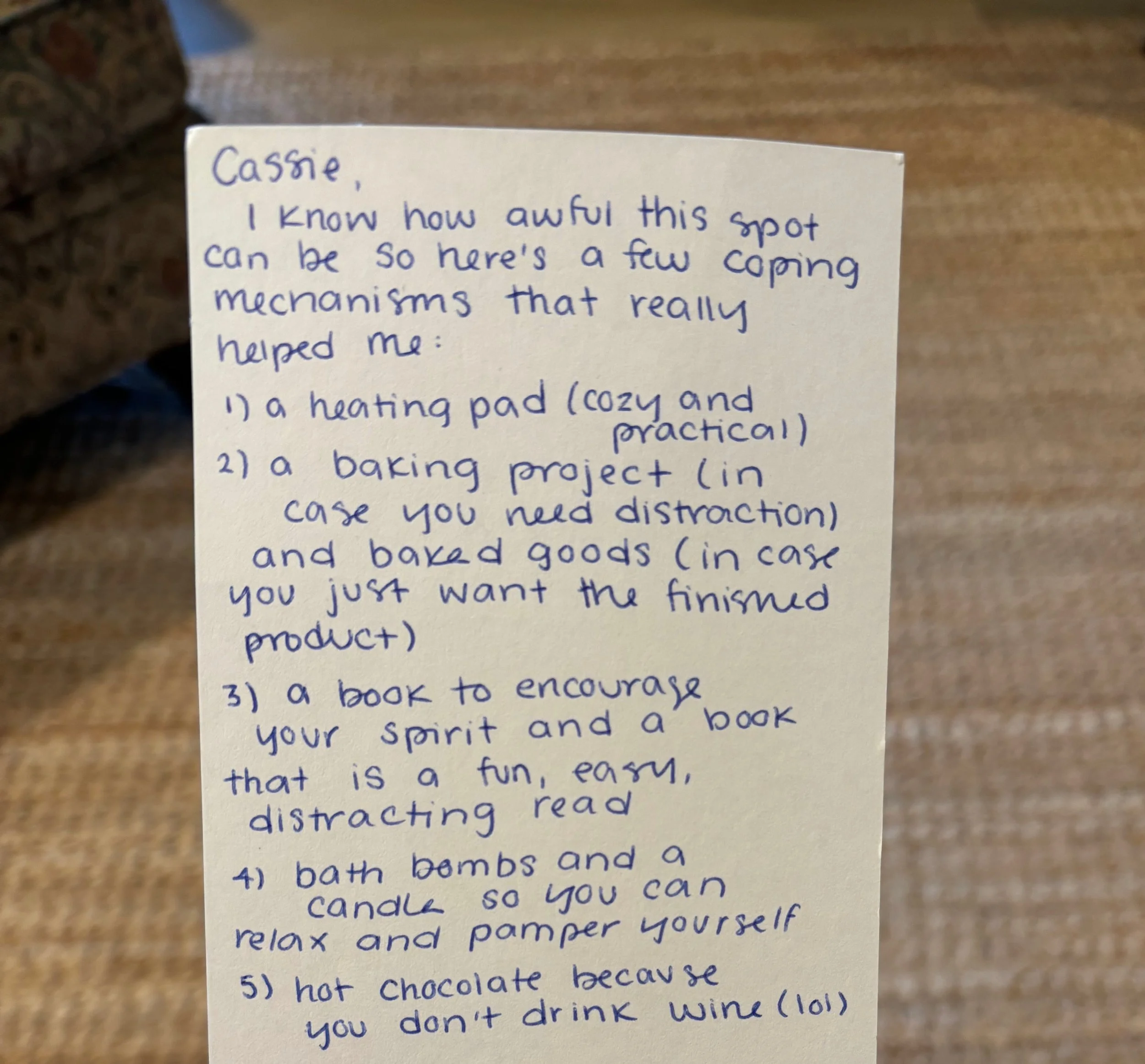 I’ve put together many care packages using a template from a card I received from a friend. Though it’s designed for miscarriage, it’s versatile enough to adapt for other situations. You can see the template in the image below.